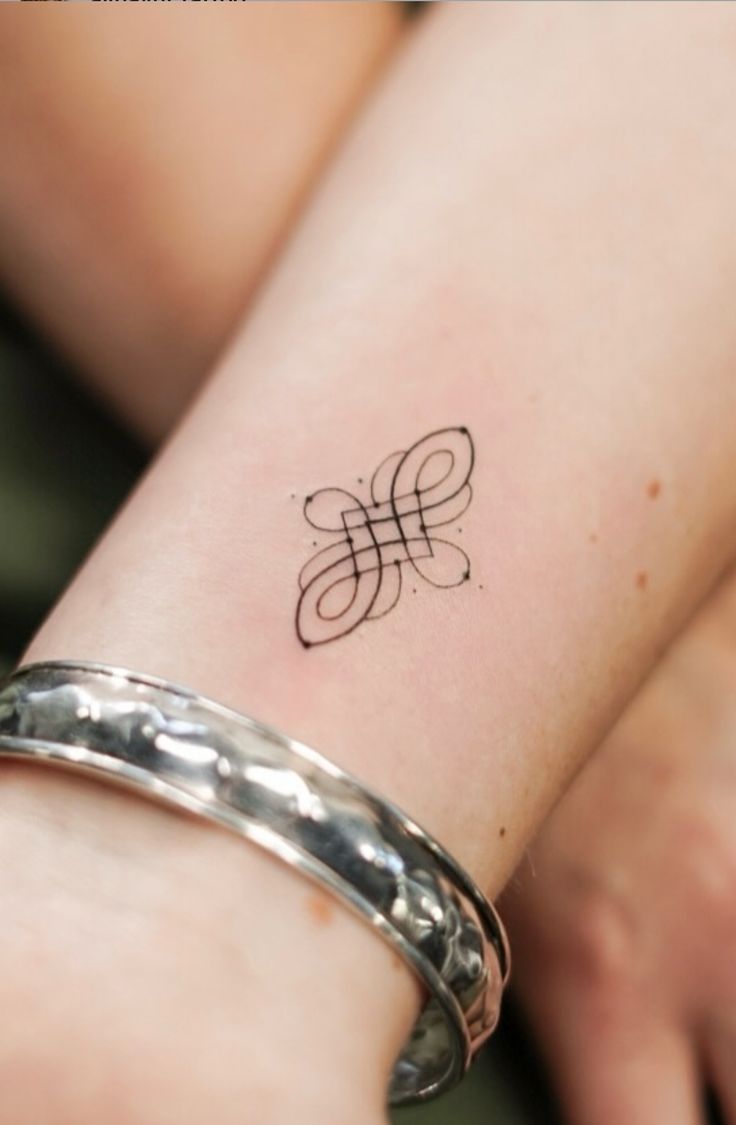 This tiny quaternary knot feels like a soft little whisper of symbolism—gentle, refined, and effortlessly feminine. The delicate lines and dot details make it look like it was drawn with a fine pen, giving the whole piece a sense of intention and quiet beauty. It’s one of those tattoos that feels intimate, like a private reminder of something meaningful.