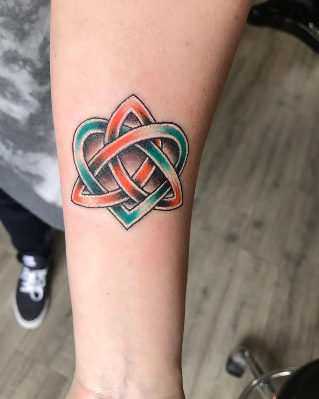 These matching triquetra tattoos feel joyful and full of personality—like two stories woven together with color instead of words. The blue and green shades give each knot its own identity while still keeping the bond obvious and intentional. There’s a playful energy here, something that feels warm and hopeful.