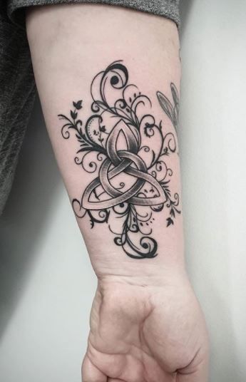 This ornamental take on the Trinity knot brings drama and elegance together in one lush, flowing design. The swirling lines and botanical-inspired curls make it feel almost like a piece of jewelry etched directly into the skin. It’s feminine, expressive, and full of movement—perfect for anyone who wants their ink to feel alive and artistic.