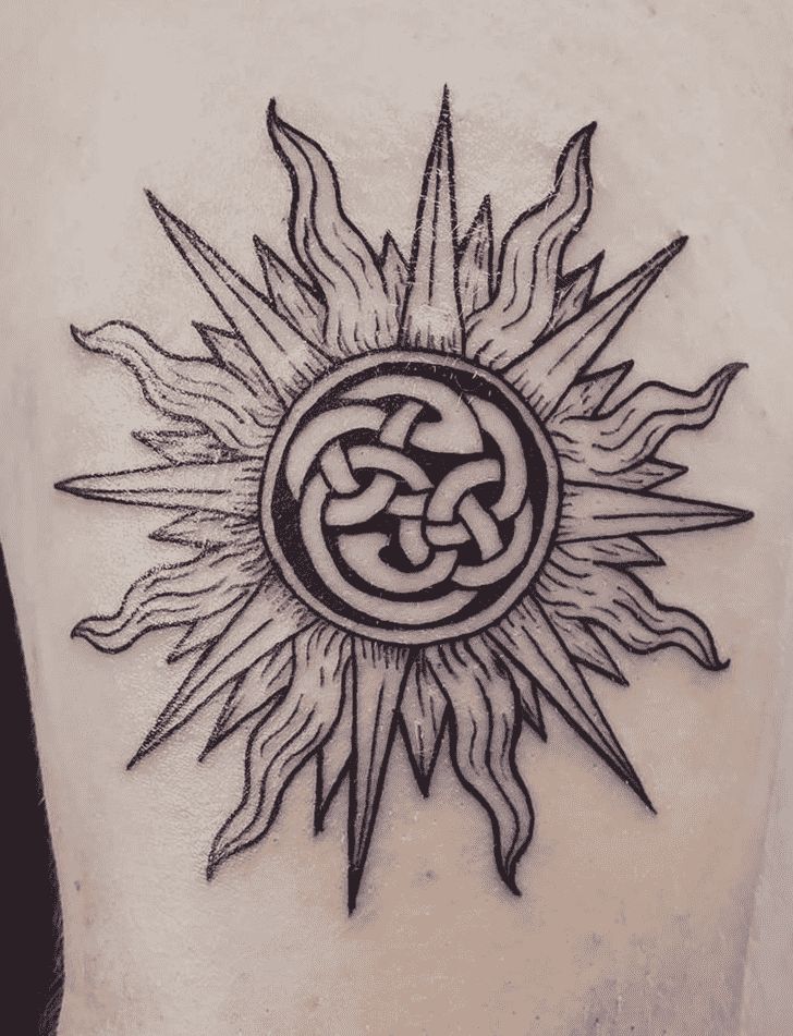 This bold Celtic sun design radiates power and warmth, almost like it carries its own energy. The knot in the center anchors the whole piece, while the sunbeams add drama and movement. It has that classic warrior-esque vibe—striking, timeless, and full of symbolic meaning tied to strength, guidance, and renewal.