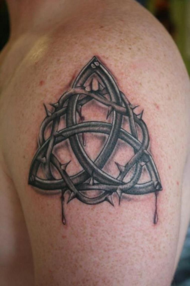 There’s an intensity to this thorn-wrapped Trinity knot that feels raw and deeply symbolic. The way the branches twist through the traditional shape gives it an edge, like a story of resilience carved through hardship. It has a powerful presence on the shoulder, almost like a personal emblem of strength and meaning blended into one striking design.