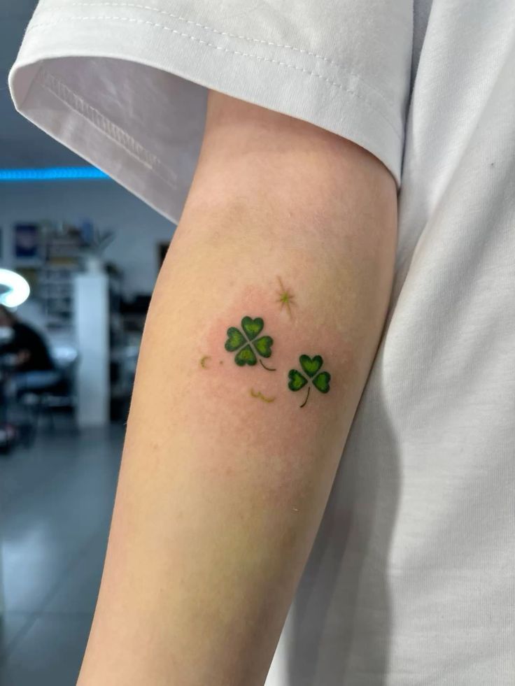These tiny clovers are just plain adorable. There’s something so sweet about the pair of small green designs sitting side by side, especially with that little sparkle detail nearby. They feel youthful, friendly, and full of good energy without being overly precious. Whether you read them as matching tattoos, friendship symbols, sister ink, or just a playful double-Lucky moment, they carry a really light and happy feeling. I love tattoo ideas like this because they prove you don’t need a lot of size to create something memorable. Small, cheerful, and charming, this one has a very easy kind of beauty.