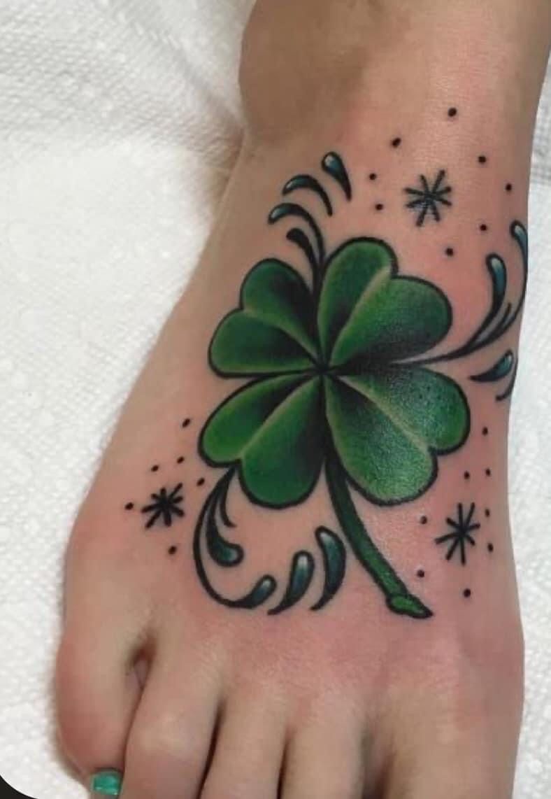 This foot tattoo has such a breezy, beachy sweetness to it. The soft green clover paired with those curling blue-black vines gives the whole design movement, like a tiny decorative flourish that just happened to land in the prettiest spot. It feels playful and feminine, with a little bit of vacation energy built right in. I also love how the design stretches naturally across the foot instead of sitting stiffly in one place, which makes it feel more organic and flattering. If your favorite clover tattoo ideas lean whimsical and pretty, this one brings that easygoing charm in such a wearable way.