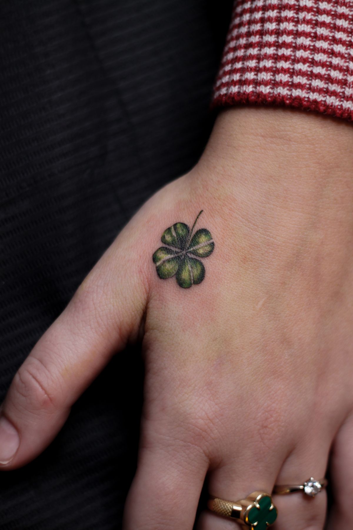 Now this is proof that tiny can still make a statement. This little clover on the hand is crisp, compact, and impossibly chic, with rich green shading that gives it life without overcomplicating the look. It has that cool, confident energy that says you know exactly what you like. There’s no extra fuss here—just a clean four-leaf clover, placed where it feels bold and personal at the same time. I also love the way it reads, almost like a lucky charm you wear every day, especially with rings nearby. If you’re into Small four leaf or Tiny four leaf tattoo ideas that still feel polished and intentional, this one has that perfect balance of charm and edge.