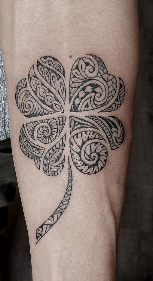 This design works especially well for women or men who want a tattoo with a stronger graphic structure instead of soft color or floral sweetness. The black patterning tends to age beautifully, and it makes the piece feel substantial without relying on size alone. In 2025, richly detailed blackwork is still a favorite for people who want something timeless with an artistic edge, and this fits right into that mood. It’s ideal if you like symbolism, heritage-inspired design, or tattoos that feel a little more powerful than pretty. This isn’t the shyest clover on the list, and that’s exactly why it stands out.