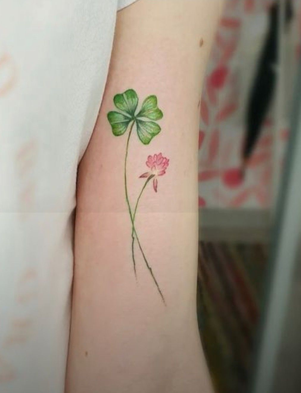 This tattoo has that soft, pressed-flower kind of beauty that instantly feels personal. The long, whisper-thin stems, the airy green clover, and that tiny pink bloom all come together in a way that feels light, feminine, and just a little dreamy. It doesn’t try too hard, which is exactly why it’s so pretty. There’s a quiet romance to it, almost like a small spring memory saved on the skin. I especially love how the four-leaf clover brings in that Lucky meaning while the flower keeps the whole design feeling fresh and graceful. For women who want clover tattoo ideas with a poetic, delicate mood, this one is a lovely little standout.
