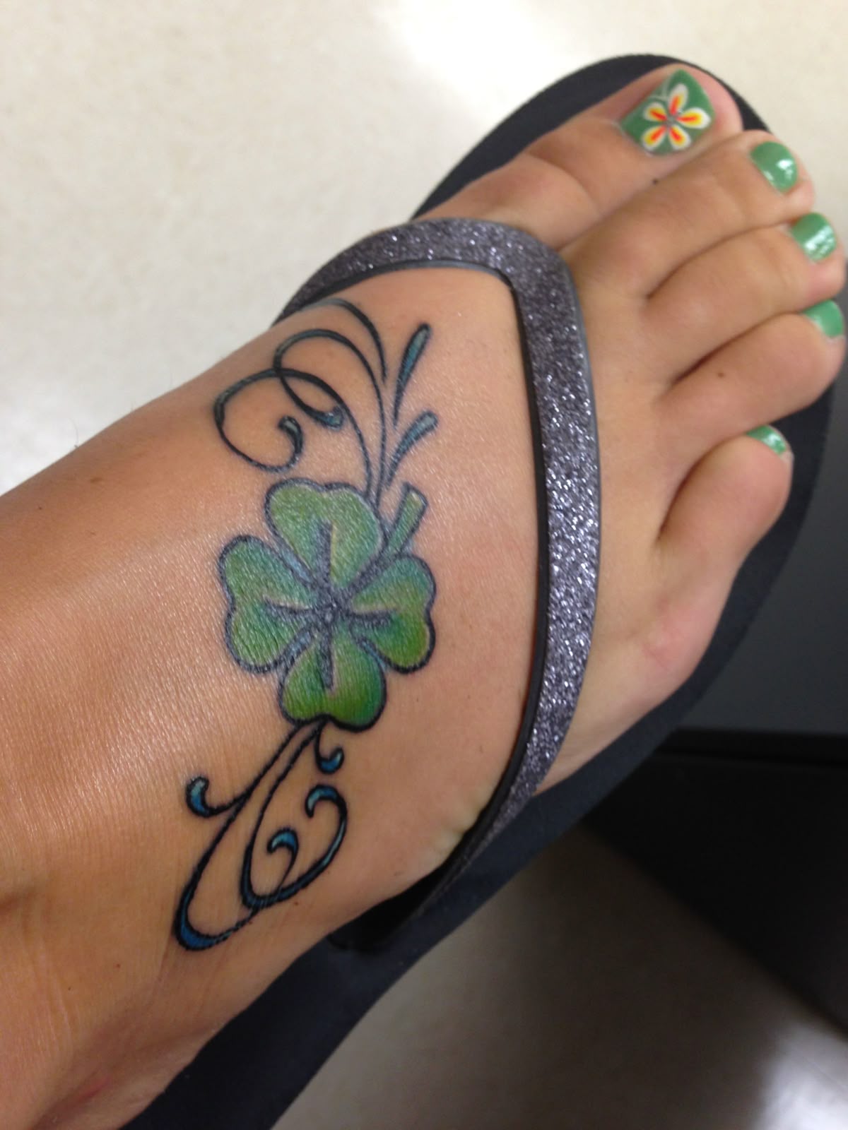 Foot tattoos like this are perfect for someone who likes a bit of flair in their everyday style. They look especially cute with sandals, slides, beachy pedicures, or anything that lets the design peek out and have its moment. What makes this one unique is the way it blends a straightforward clover symbol with decorative elements that give it extra rhythm and charm. Compared with a plain 4-leaf tattoo, this version feels more expressive and a lot more playful. Just remember that foot tattoos can take a bit more healing patience, but once settled, they have such a flirty, eye-catching payoff.