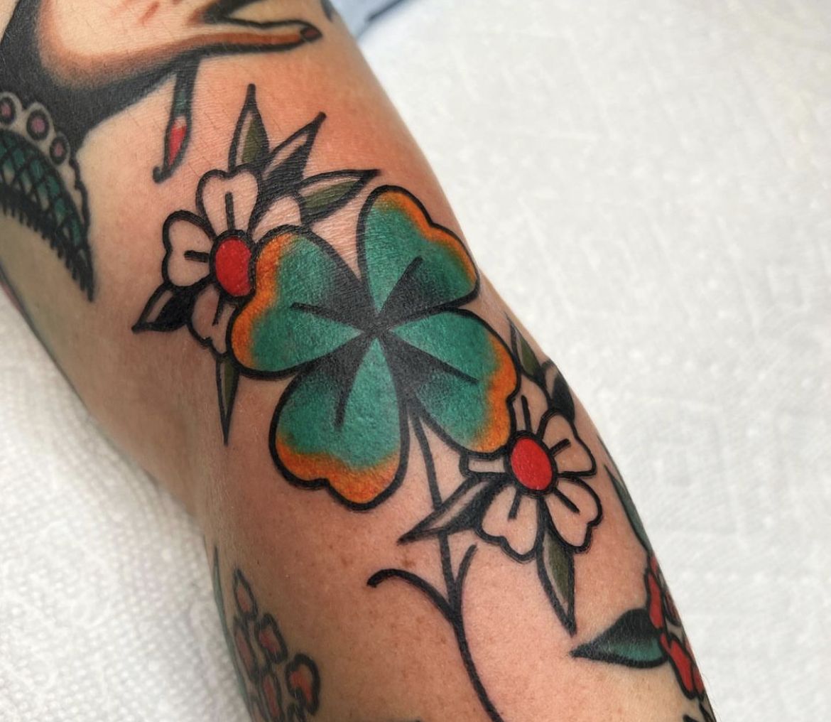 If your taste leans bold, graphic, and a little vintage, this Traditional clover tattoo is such a standout. The saturated green clover, deep black outlines, and those sweet daisy-like flowers with Red centers give it a punchy old-school personality that feels cheerful and fearless. It doesn’t whisper—it smiles right at you. I love tattoo ideas like this because they have instant presence and that timeless tattoo-shop attitude people never really stop loving. There’s a lovely contrast between the soft luck symbolism of the clover and the stronger styling of the piece, which keeps it from feeling overly delicate. It’s bright, grounded, and absolutely full of character.