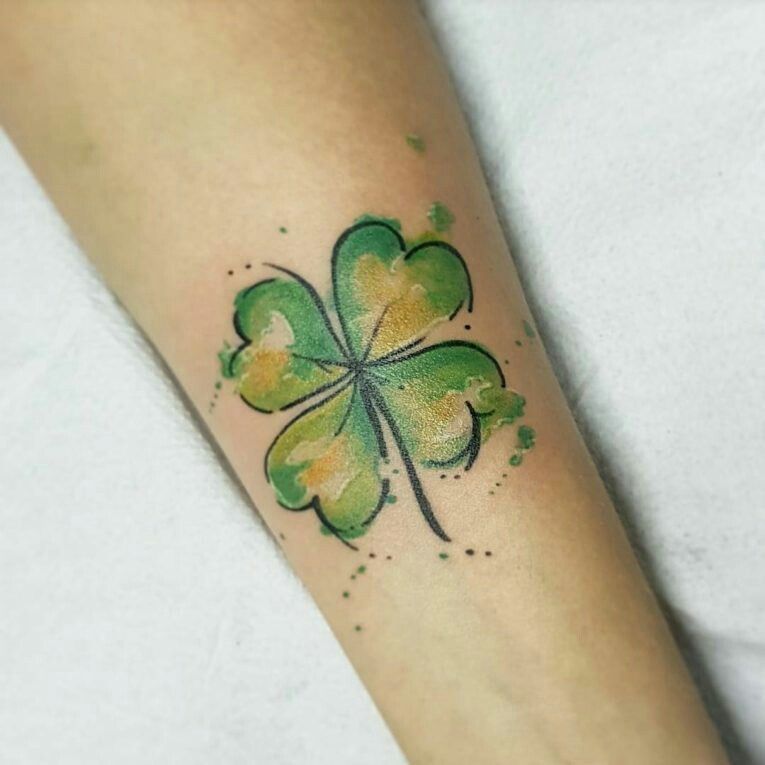 This clover tattoo feels bright and painterly, almost like a lucky little watercolor swatch brushed onto the skin. The mix of green and soft golden tones gives the petals a luminous look, and those tiny splatter details around the edges keep it feeling light and artistic. I really love this kind of design when someone wants a symbol with a classic meaning but a more modern finish. It still reads as a 4-leaf clover right away, but the airy color treatment makes it feel softer, fresher, and a little more creative than a standard fill-in tattoo. It’s playful, polished, and full of life.