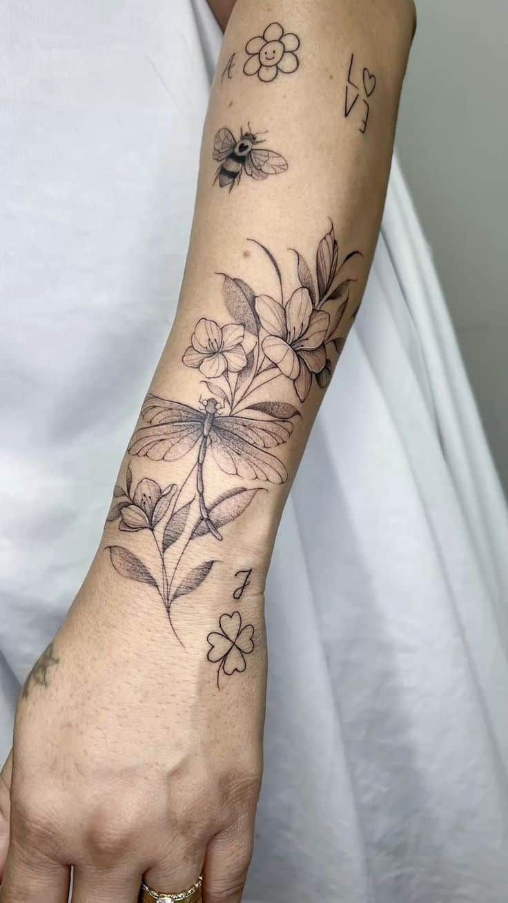 This forearm piece feels like a soft botanical sleeve in progress, with flowers, leaves, a dragonfly, tiny hearts, and playful little symbols woven together. It has a youthful sweetness, but the fine line technique keeps it grown-up and wearable. The floral details bring a feminine mood, while the insect wings add movement and lightness. It is one of those ideas for women that feels personal, pretty, and collected—like every element could represent a different season of life.