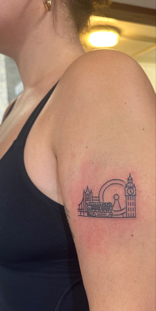 This upper arm placement works because the horizontal composition has room to stretch without becoming too wide. City designs need careful simplification, so choose only the landmarks that matter most instead of squeezing in every detail. It is a great option for women and men who prefer meaningful tattoos that still look graphic and modern. Wear it with sleeveless tops, simple gold hoops, or a crisp white shirt, and it gives just enough personality without taking over your whole look.