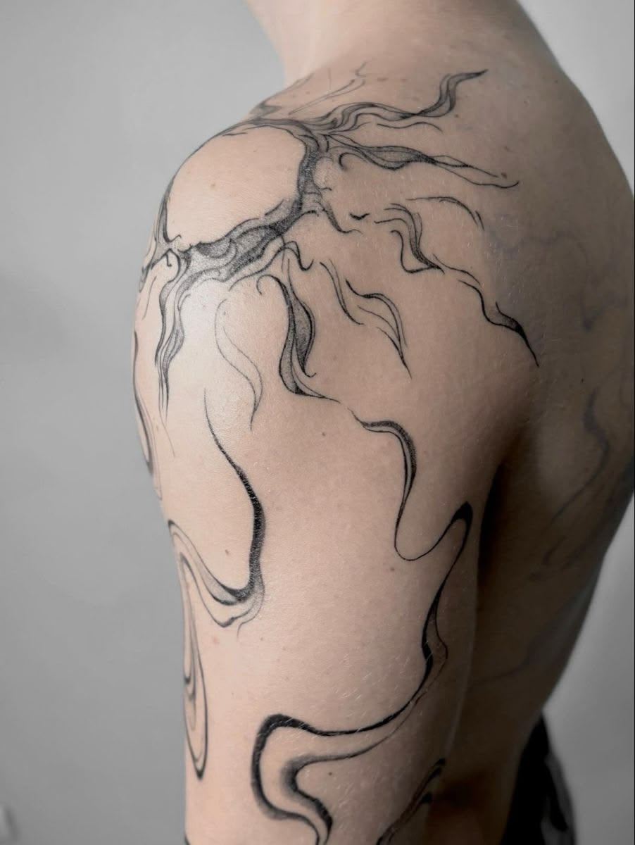 This shoulder tattoo has a moody, almost sculptural energy. The lines move like smoke, waves, branches, or emotion itself—open to interpretation, which is exactly what makes it interesting. It does not spell everything out, and that gives it a stylish edge. The mix of fine curves and darker textured sections creates depth without becoming too heavy. For someone who loves unique designs that feel more like wearable art than a literal symbol, this is a powerful direction.