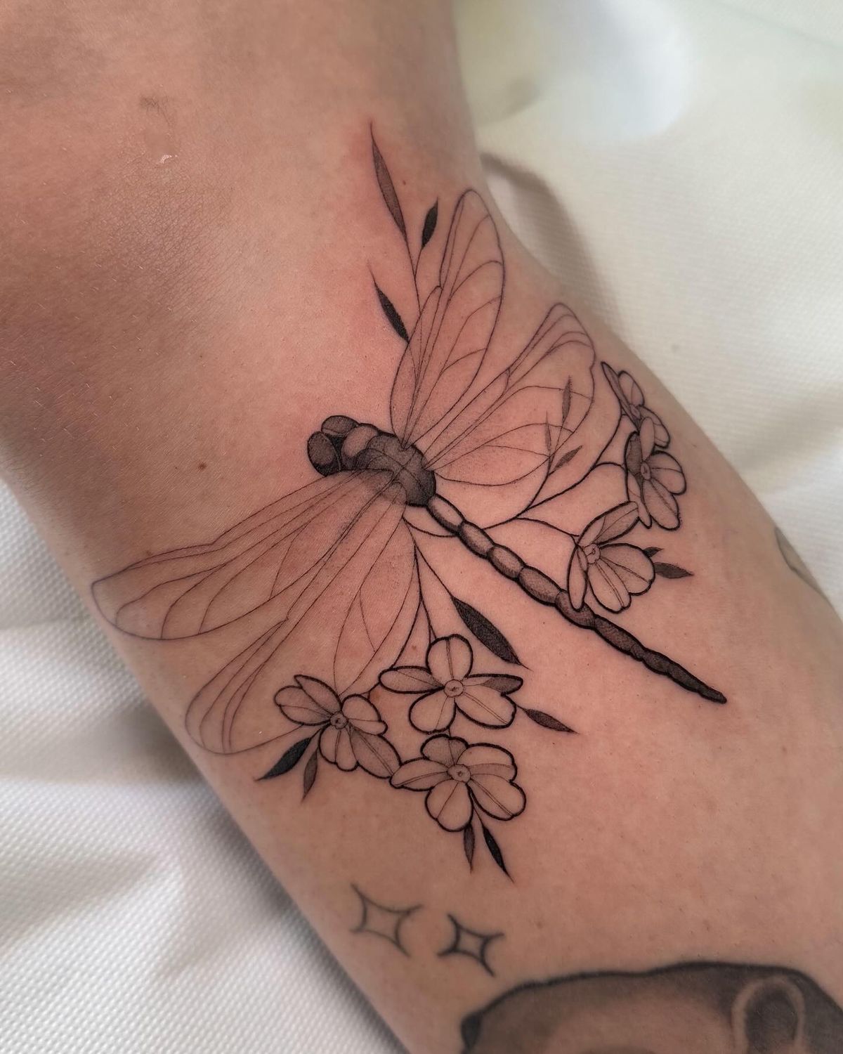 9. Dragonfly and Flower Fine Line Tattoo