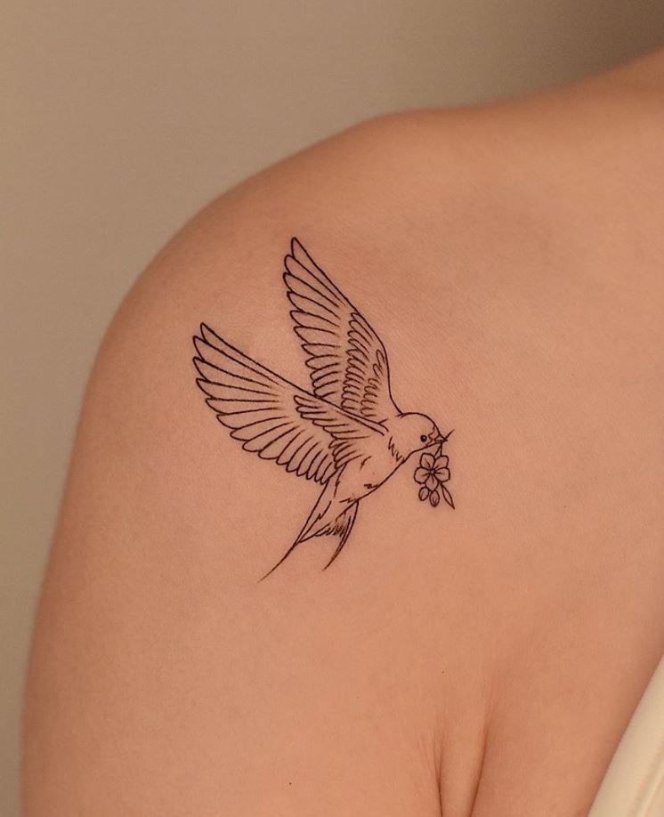 This shoulder tattoo has a soft, hopeful beauty to it. The bird’s open wings and tiny flower in its beak create a peaceful message without needing any text at all. It feels romantic, spiritual, and clean — the kind of design that can mean freedom, love, remembrance, or simply a gentler chapter ahead. The linework is delicate but confident, making it one of those fine-line tattoo ideas that look graceful from every angle.