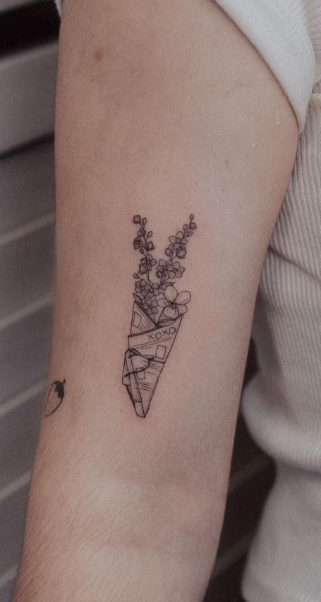 This wrapped bouquet has such a gentle, thoughtful mood—like receiving flowers from someone who remembered exactly what you love. The paper cone, tiny “xoxo” detail, and airy stems make it feel romantic without becoming too polished. It is dainty, but not invisible; sweet, but still grown-up. Among fine-line tattoo ideas, this one is perfect for anyone who wants something soft and meaningful, with a little handmade charm that feels more personal than a standard floral design.