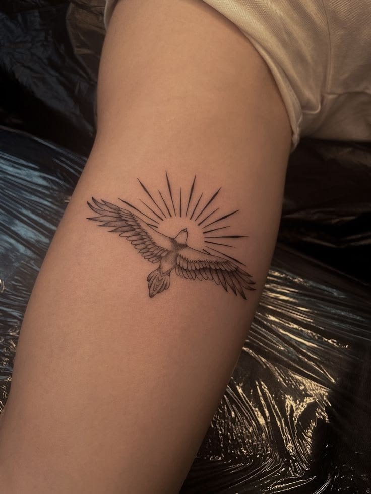 A bird in flight always carries a little emotion, doesn’t it? This dove design feels peaceful, open, and quietly powerful, especially with the sunburst lines spreading behind the wings. It has that fresh-start energy — freedom, healing, faith, or simply the decision to move forward with a lighter heart. The linework keeps it delicate, while the wings add enough detail to make it feel alive. For anyone browsing meaningful fine line tattoo ideas, this one has a beautiful balance of softness and strength.