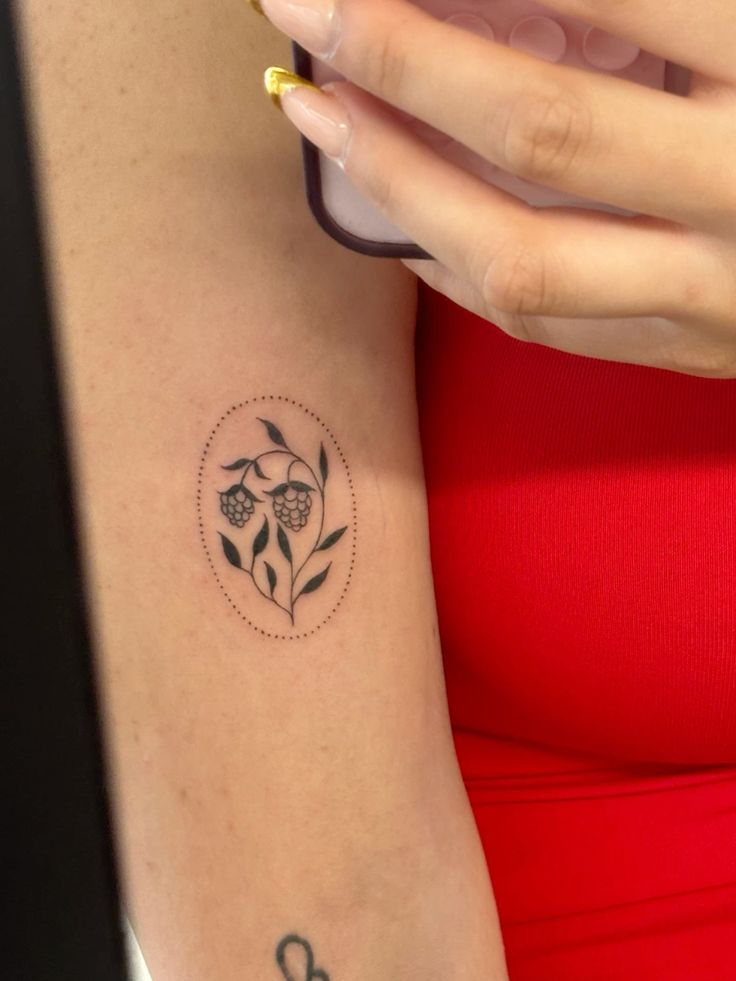 This is a lovely arm tattoo for anyone who wants something small, balanced, and low-maintenance. The oval shape makes it feel finished, so it does not need extra symbols around it, though it could pair beautifully with future floral designs. It is especially nice for women who like dainty botanical ink, but the clean layout could work for men too with a slightly sharper leaf style. Keep the dots evenly spaced and avoid making the berries too tiny; a little extra clarity will help the tattoo stay pretty as it heals.