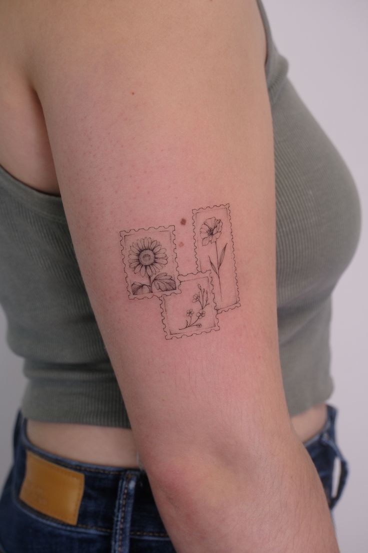 The upper arm is a smart placement for this design because the stamps need a little breathing room to stay readable. This is also a great concept if you want something unique that can carry meaning—each stamp could represent a place, a person, a season, or a flower tied to a memory. A daisy, a wildflower, or a small rose would all work well in this format. Ask your artist to create a clean stencil first and check the spacing carefully; the charm depends on those delicate borders staying balanced.