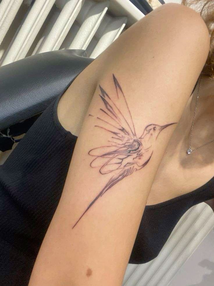 This hummingbird has a quick, sketch-like elegance, almost as if it were drawn in the middle of its motion. The long beak, lifted wings, and trailing body lines give it a light, floating feeling that is very different from a heavily shaded bird tattoo. It feels spontaneous, graceful, and quietly emotional—a lovely choice for someone who wants a symbol of energy, independence, or delicate strength. As fine-line tattoo ideas go, this one is simple but far from boring.