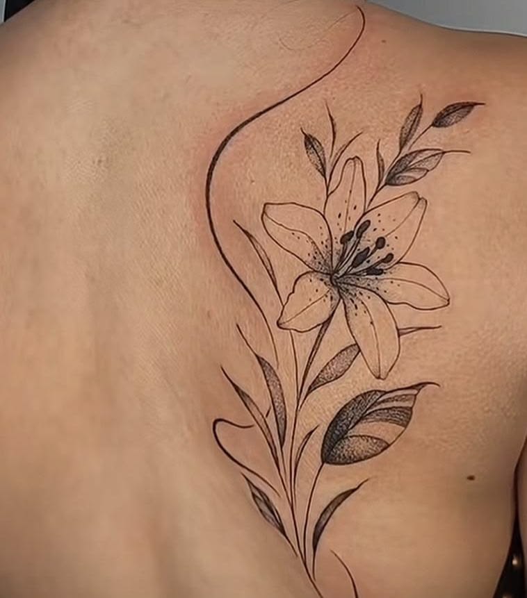 24. Elegant Fine Line Lily Back Tattoo