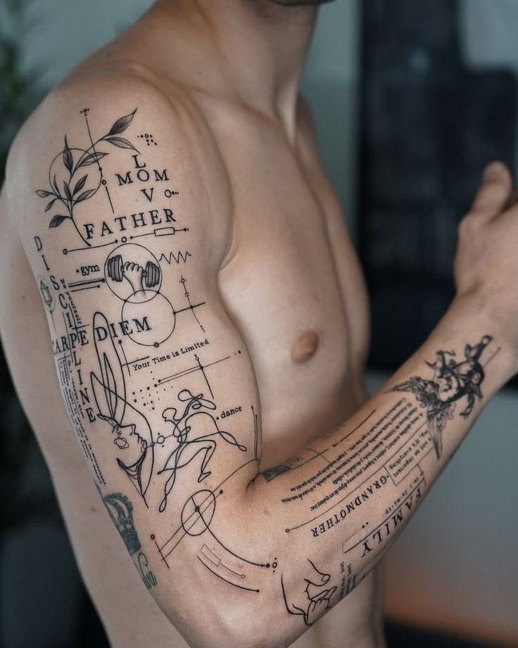 This piece feels like someone turned a private journal into skin art—layered, personal, and quietly intense. The mix of small words, symbolic sketches, botanical lines, movement, and tiny geometric marks gives it that collected-over-time feeling without looking messy. It is one of those fine-line tattoo ideas that works beautifully for people who want their ink to feel like a memory map rather than one single image. The mood is thoughtful and artistic, with a little bit of poetic chaos, which makes it especially strong for men or anyone drawn to expressive, meaningful designs.
