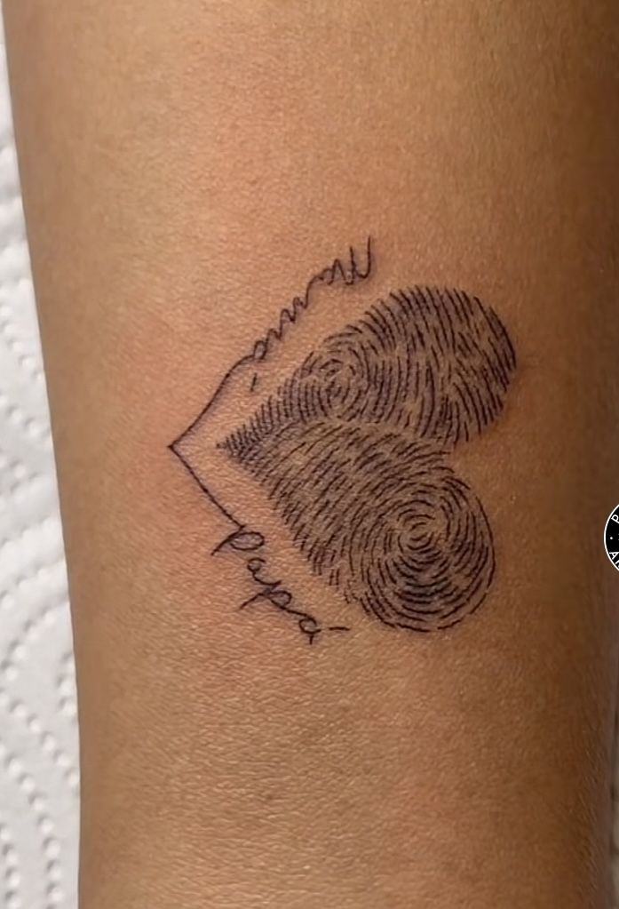 This design has such a beautiful emotional logic to it. The infinity symbol already speaks to lasting love, but placing fingerprints inside each loop makes it feel deeply personal, like two lives forever connected to yours. Adding “Papa” and “Mama” gives the piece a direct tenderness that’s impossible to miss. It feels warm, grateful, and grounded in the kind of love that doesn’t fade with time. If you want a tattoo that says forever without feeling generic, this one gets there in such an intimate way. It’s one of those fingerprint tattoo ideas that feels instantly meaningful because the symbolism is layered but still easy on the eye.