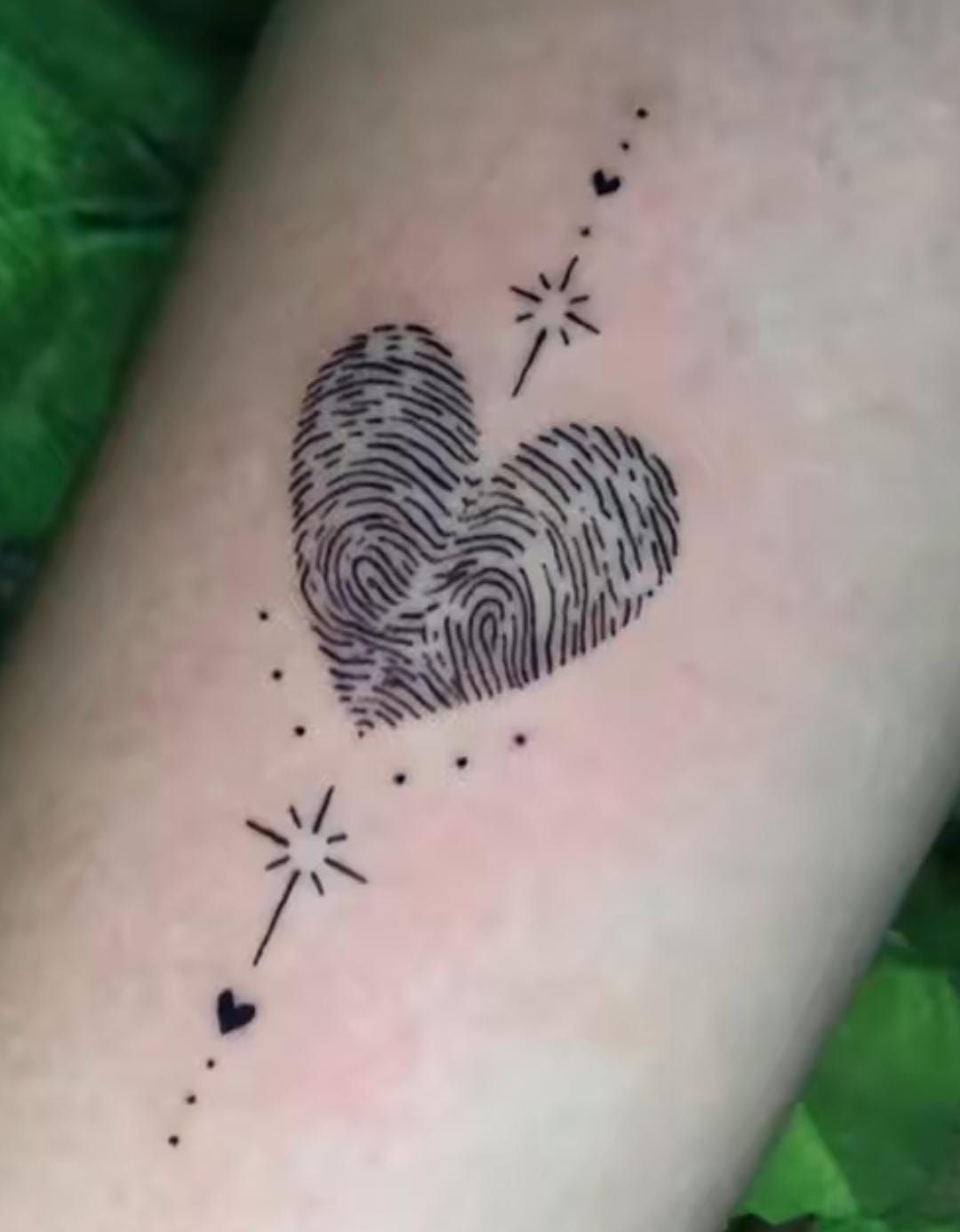 This little heart has such a playful personality. The fingerprint center gives it that intimate, personal core, but the tiny spark-like accents around it add a hint of magic that makes the whole design feel lighter and more expressive. It’s like taking a deeply meaningful tattoo and letting it flirt just a little. There’s a youthful brightness to it, but not in a way that feels immature—more like a reminder that sentimental tattoos can still have sparkle and charm. Among fingerprint tattoo ideas, this one feels extra sweet for someone who wants love, memory, and individuality wrapped into something a bit more whimsical.