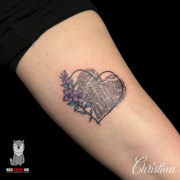 20. Fingerprint Heart with Purple Flower Tattoo