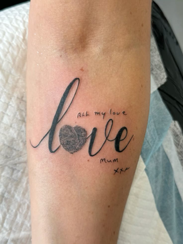 This one really tugs at you. The large flowing word “love” paired with a fingerprint heart and a note to Mum turns a simple word into something achingly personal. It feels like grief and gratitude living side by side, which is often exactly what the best memorial tattoos do. There’s a softness here, but also strength. It doesn’t hide the emotion—it wears it openly, beautifully, and with real tenderness. If you’re searching for fingerprint tattoo ideas that carry memory in a more expressive way, this one delivers that emotional weight without losing elegance. It feels like a message still being spoken, long after the moment has passed.