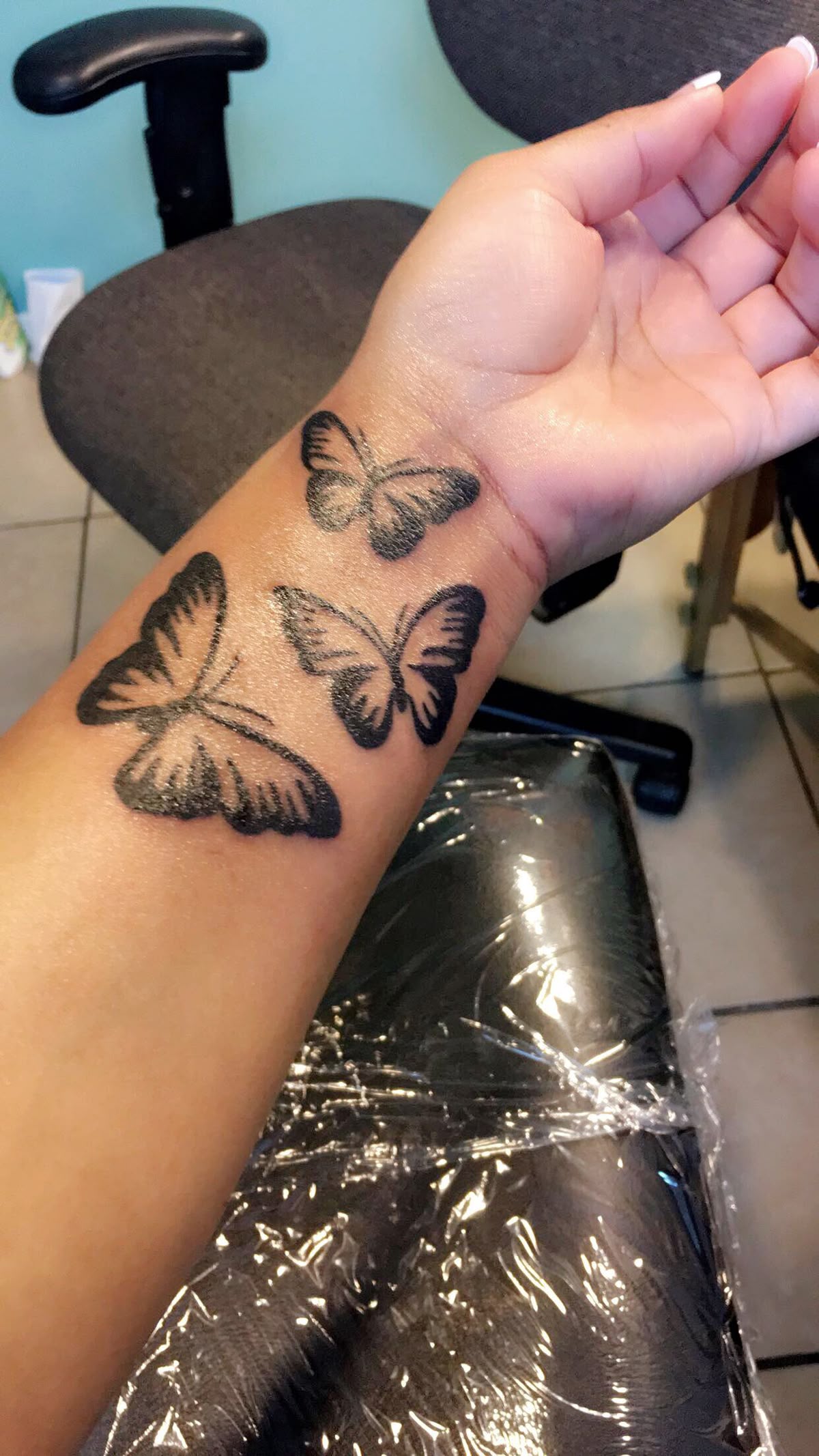 Three butterflies in motion—it’s transformation captured mid-flight. This kind of first tattoo feels symbolic of growth and change, which is exactly what stepping into adulthood (and ink) is about. The bold black shading gives it strength and depth.