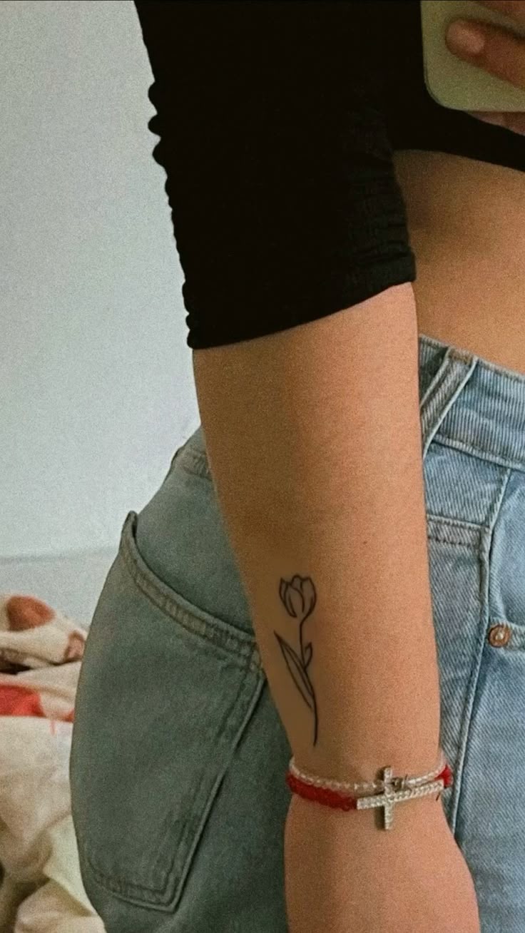 A single tulip drawn in clean lines feels fresh, understated, and quietly confident. It’s the kind of first tattoo that doesn’t try too hard—it just exists beautifully. There’s something so feminine yet modern about a lone flower climbing gently along the arm, like a personal signature.