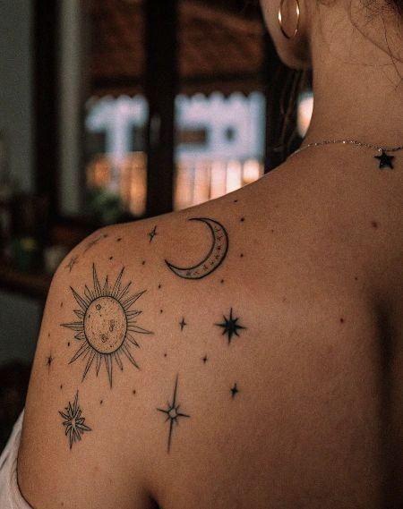 This placement on the Shoulder is especially flattering for Women meaningful shoulder ideas, but it can work for Male designs as well. The scattered stars create movement and allow room to add more later, making it a thoughtful starting point.