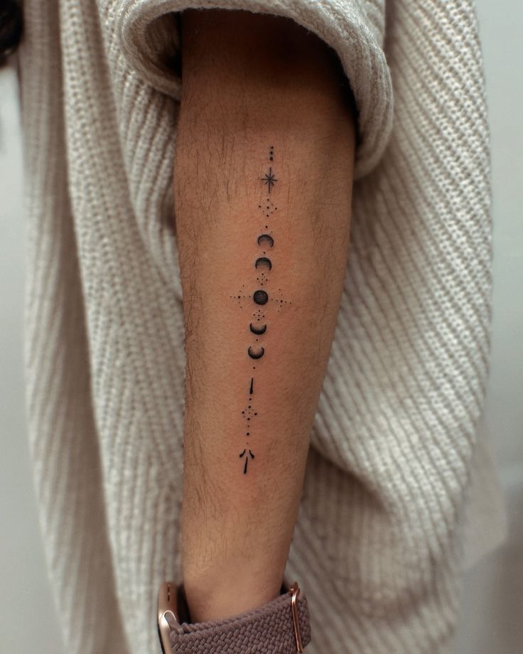 There’s something quietly powerful about a vertical row of moon phases. It feels introspective, like you’re honoring every version of yourself—the growing, the glowing, the fading, and the rebirth. For a first tattoo, this kind of celestial design speaks to evolution and personal rhythm. It’s subtle, but it carries deep Meaning without needing words.