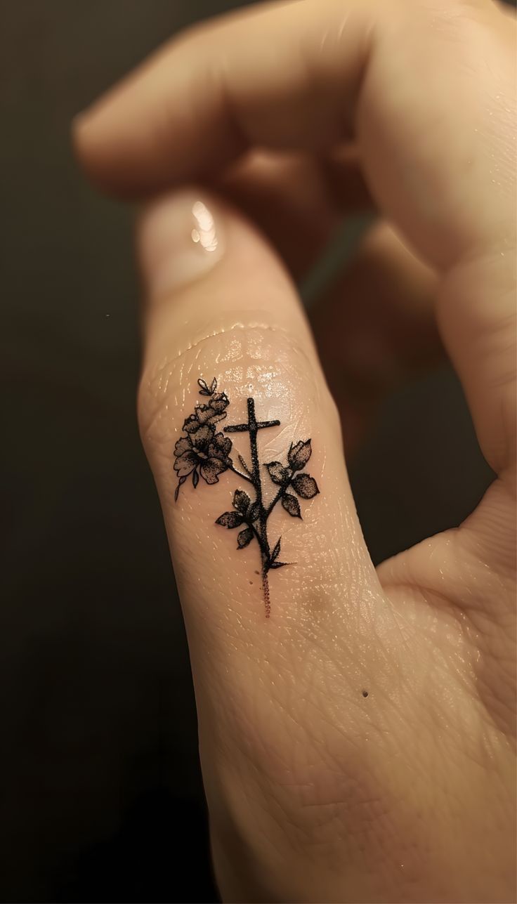 There’s something incredibly intimate about a delicate cross wrapped in soft florals, especially when it’s placed so subtly on the side of the finger. It feels like a quiet promise you carry with you—faith, growth, or even a reminder of where you started. For a first tattoo, this kind of small, simple design doesn’t scream for attention. It whispers. And honestly? That’s what makes it so powerful.