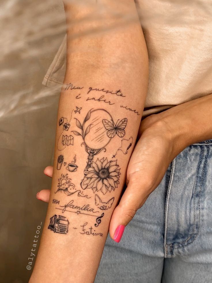 This collage-style Forearm tattoo feels like a scrapbook brought to life. A mirror, sunflower, butterfly, handwritten words—each element tells a different chapter. For a first tattoo, choosing multiple small symbols can feel like creating a visual diary of who you are.