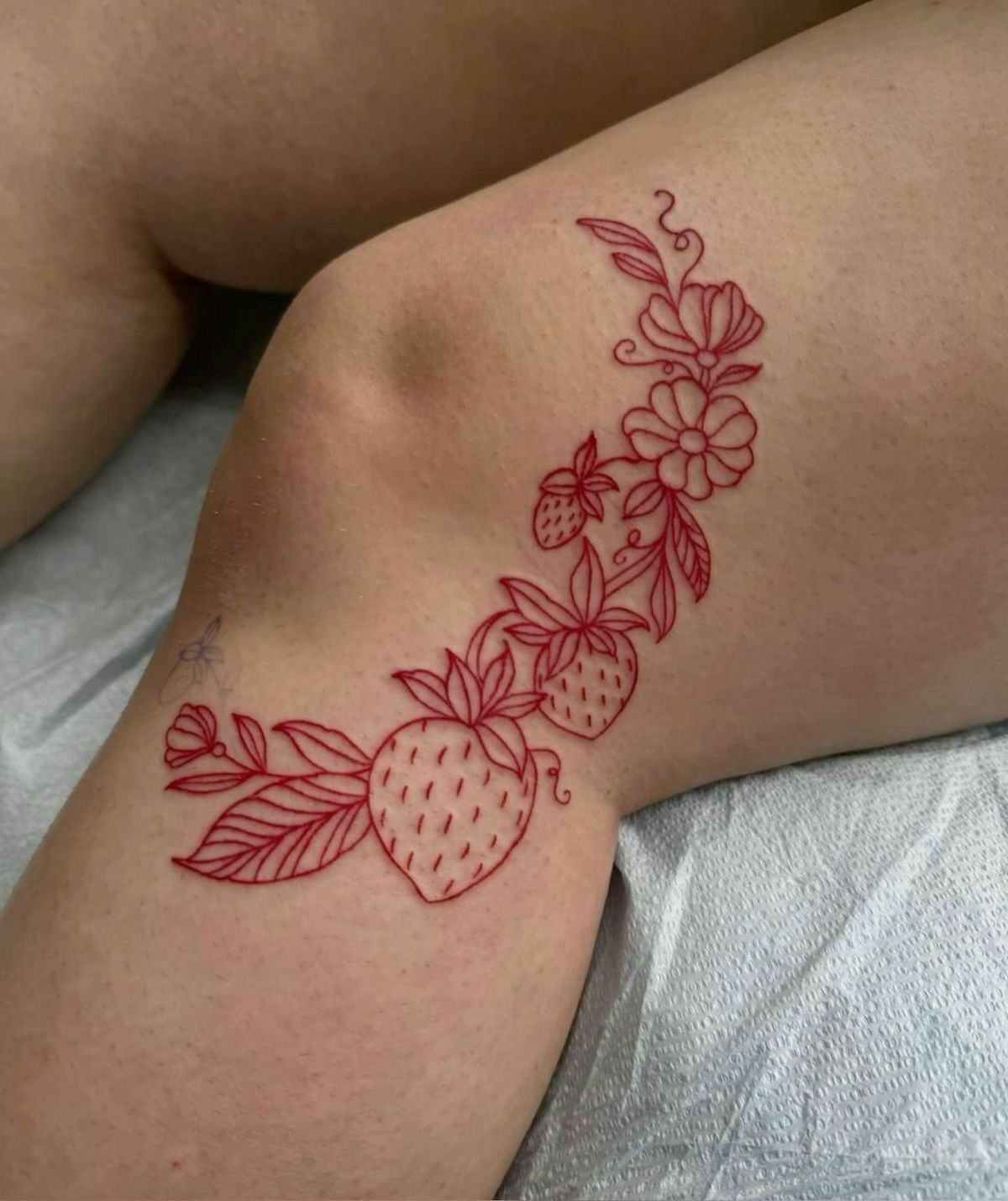 This red strawberry vine wrapping along the leg feels playful yet bold. The flowing line of fruit and florals creates movement, almost like it’s dancing across the skin. As a first tattoo, it makes a statement—confident, feminine, and just a little daring.