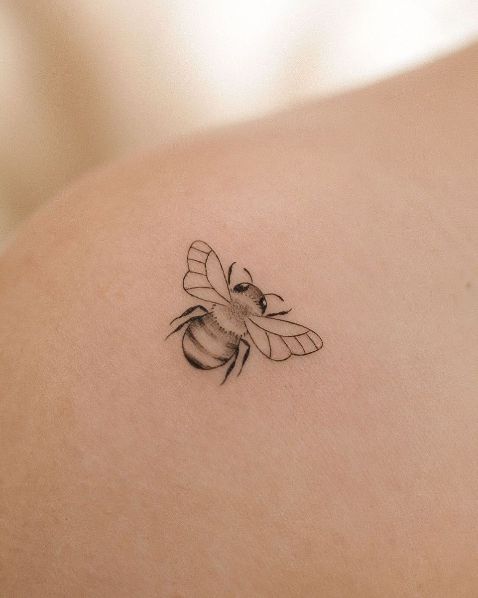 A little bee might be small, but symbolically it’s huge—hard work, community, resilience. The soft shading gives it a lifelike touch that feels delicate rather than cartoonish. As a first tattoo, it’s meaningful without being heavy.