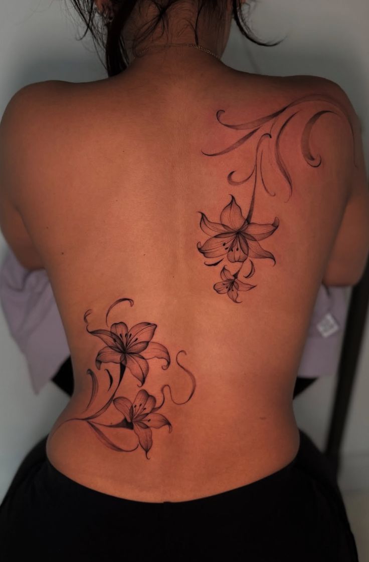 This tattoo has movement all over it, and that is exactly why it feels so captivating. Instead of sitting stiffly in one place, the flowers drift across the back like they were carried there by warm air. The result is sensual, artistic, and just a little dramatic, with those Lily blooms creating softness while the curving lines add rhythm. It feels less like a tiny accent and more like body art with presence. If you like your tattoo ideas to feel expressive rather than overly tidy, this kind of composition has a gorgeous confidence to it.