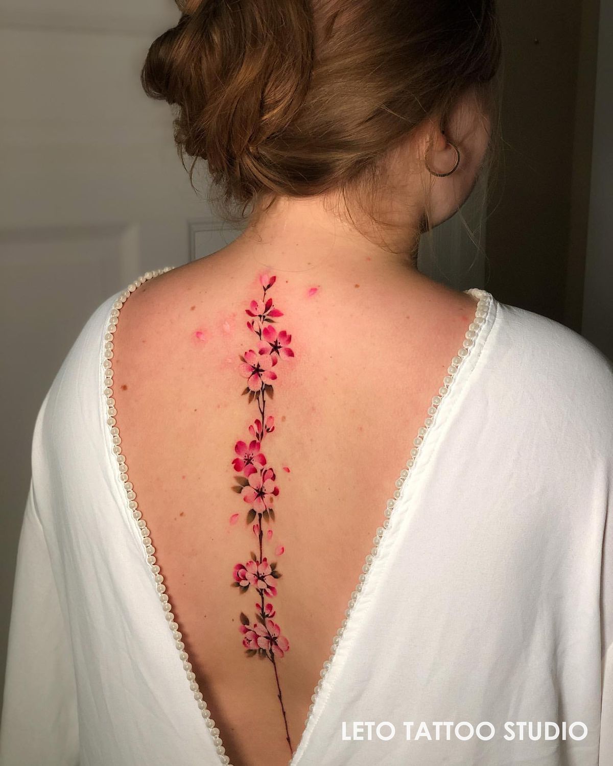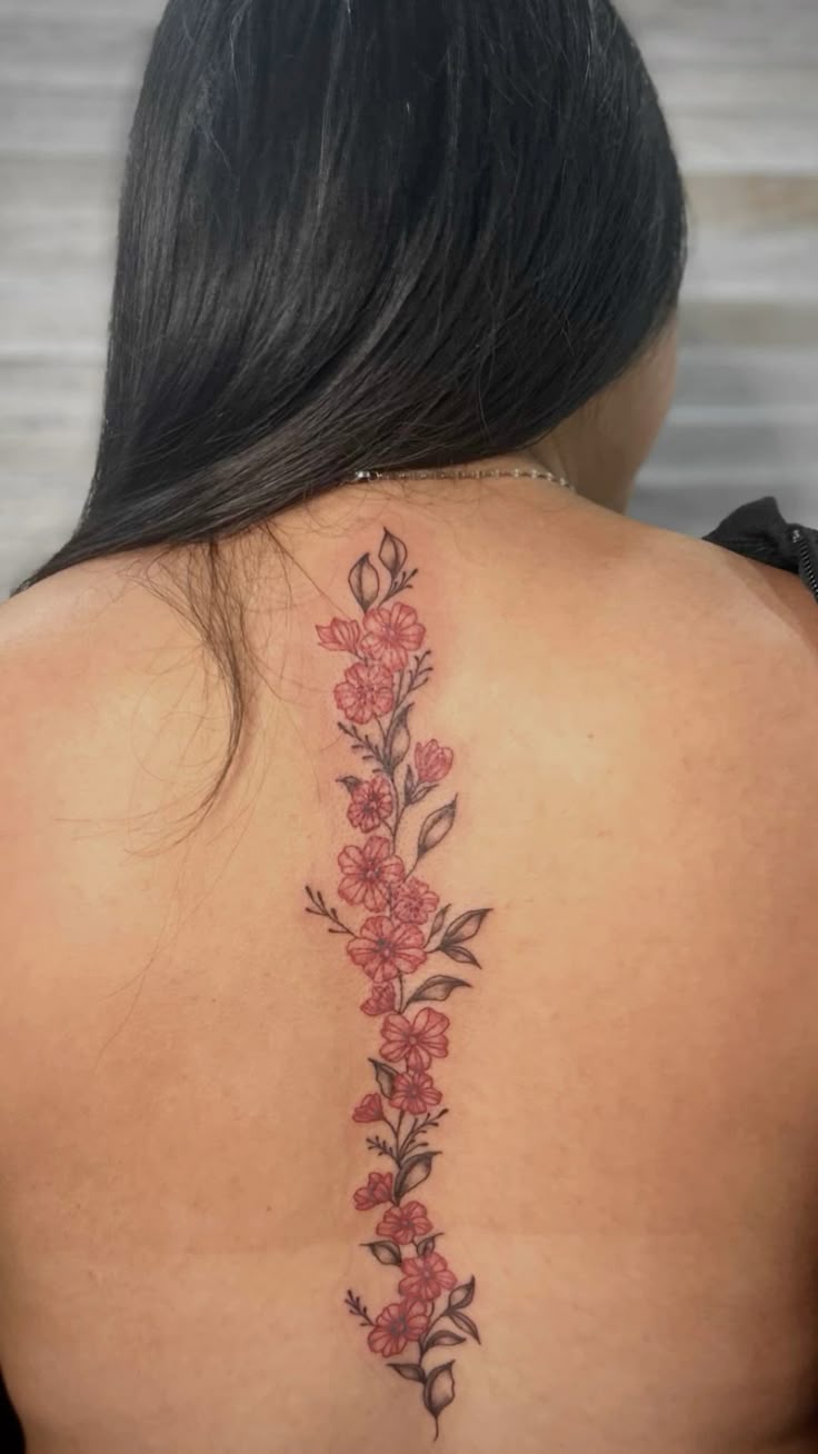 This tattoo feels sweet, polished, and beautifully romantic without tipping into anything overly precious. The tiny rosy flowers stacked along the spine create this soft garland effect that feels almost vintage, like pressed blooms turned into something permanent and modern. I love how the color stays muted enough to feel elegant, while the repeated blossoms give the design rhythm and presence. It has a very flattering vertical flow, and because the flowers are smaller and closely spaced, the whole piece feels delicate but still complete. There is something very charming about a floral tattoo that does not try too hard to be dramatic. It just quietly makes the whole back look more graceful.