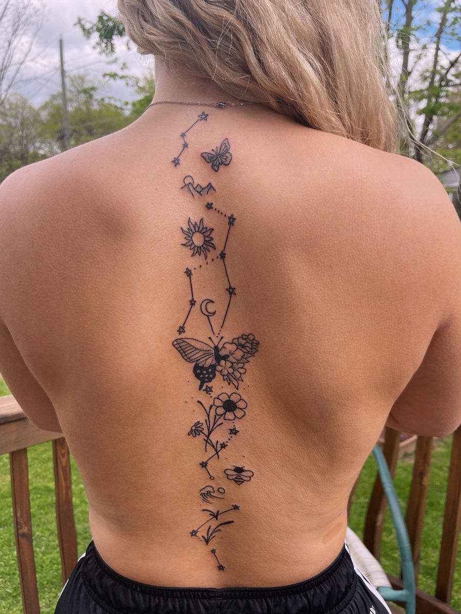 If plain floral work feels too expected, this is the kind of design that makes trying something new very tempting. It is perfect for someone who wants spine tattoo ideas with a little symbolism, a little drawing-like charm, and lots of individuality. The trick is balance, so make sure your artist keeps the tiny details crisp and cohesive. When done well, a piece like this feels personal, imaginative, and much more memorable than a standard flower-only tattoo.