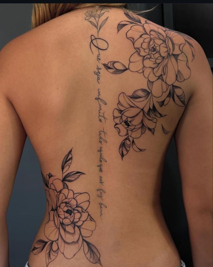This piece feels romantic, grown-up, and just a little dramatic in the best possible way. The flowers frame the back with a soft confidence, while the vertical script through the center gives the whole tattoo a deeply personal heartbeat. It does not read like decoration alone. It reads like a memory, a promise, or something quietly powerful that belongs to the person wearing it. I love the way the blooms sit off to the sides instead of stacking neatly down the spine because it makes the witty words element feel even more intimate. There is movement, softness, and elegance here, but also enough scale to make it unforgettable when the back is bare.