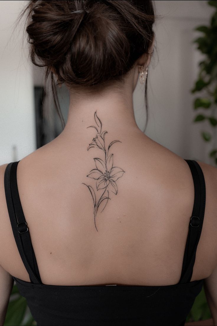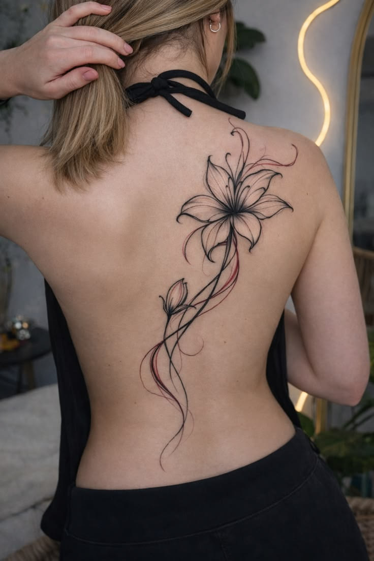 If you have been saving simple flower tattoo ideas and still cannot decide what to get, this is the kind of design that makes saying yes feel easy. It is ideal for someone who wants a Lily tattoo with a graceful spine influence but not a full-back commitment. The beauty here is flexibility: you can keep it minimal forever or build on it later with more florals, a Butterfly and stem accent, or even a subtle cover-up element if your tattoo story grows.