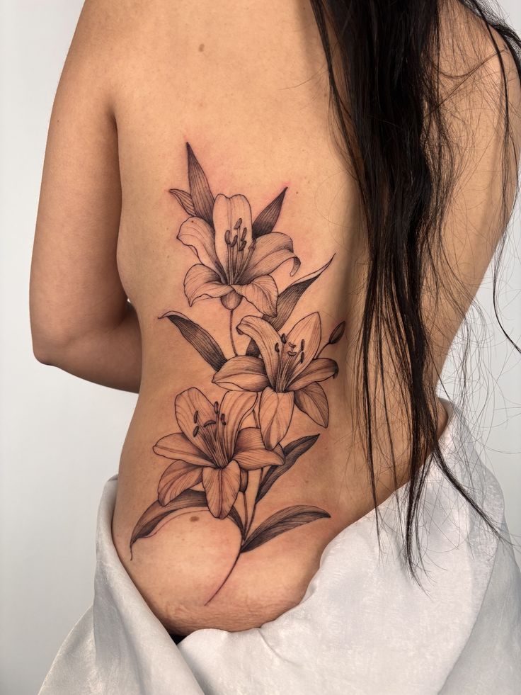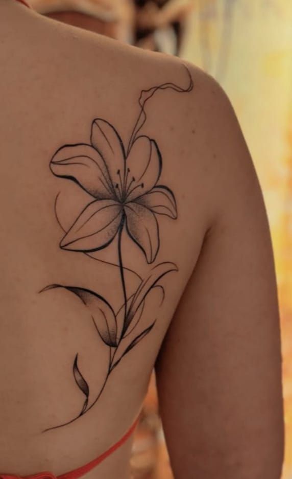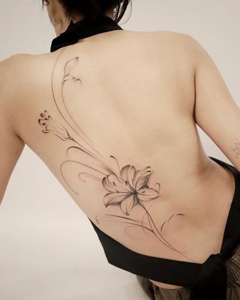 What makes this design special is the way it combines Lily softness with a more modern, off-center placement. Compared with a stricter spine tattoo, this feels freer and more fashion-forward while still giving you that beautiful length through the back. It is ideal for anyone who likes floral ideas that look elegant but not too precious. A good artist will keep the lines light and the petal shading soft so the entire design holds onto that airy fine-line character instead of becoming too heavy.