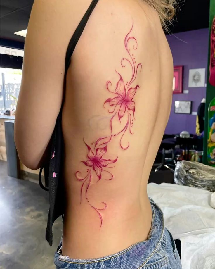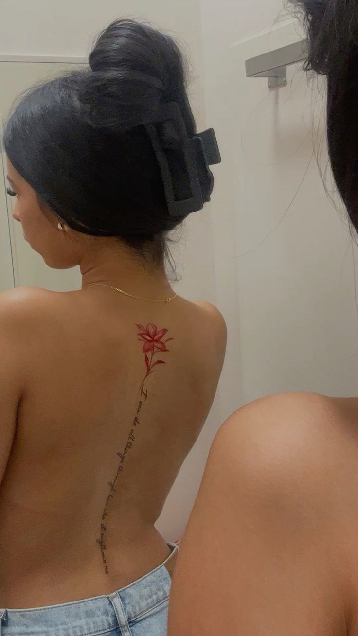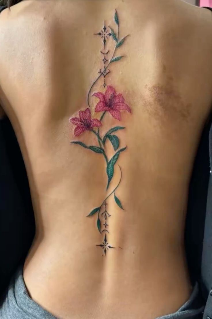 In 2026, more people are leaning into expressive floral color again, and this kind of Hibiscus-inspired design fits right into that mood. It is perfect if you want flower spine tattoo ideas that feel less expected than standard black ink. Because pink tones can soften as they heal, aftercare matters here: protect it from sun, keep the lines moisturized, and choose an artist who understands color saturation. It is a beautiful pick for someone who wants a tattoo that feels fun, feminine, and current.