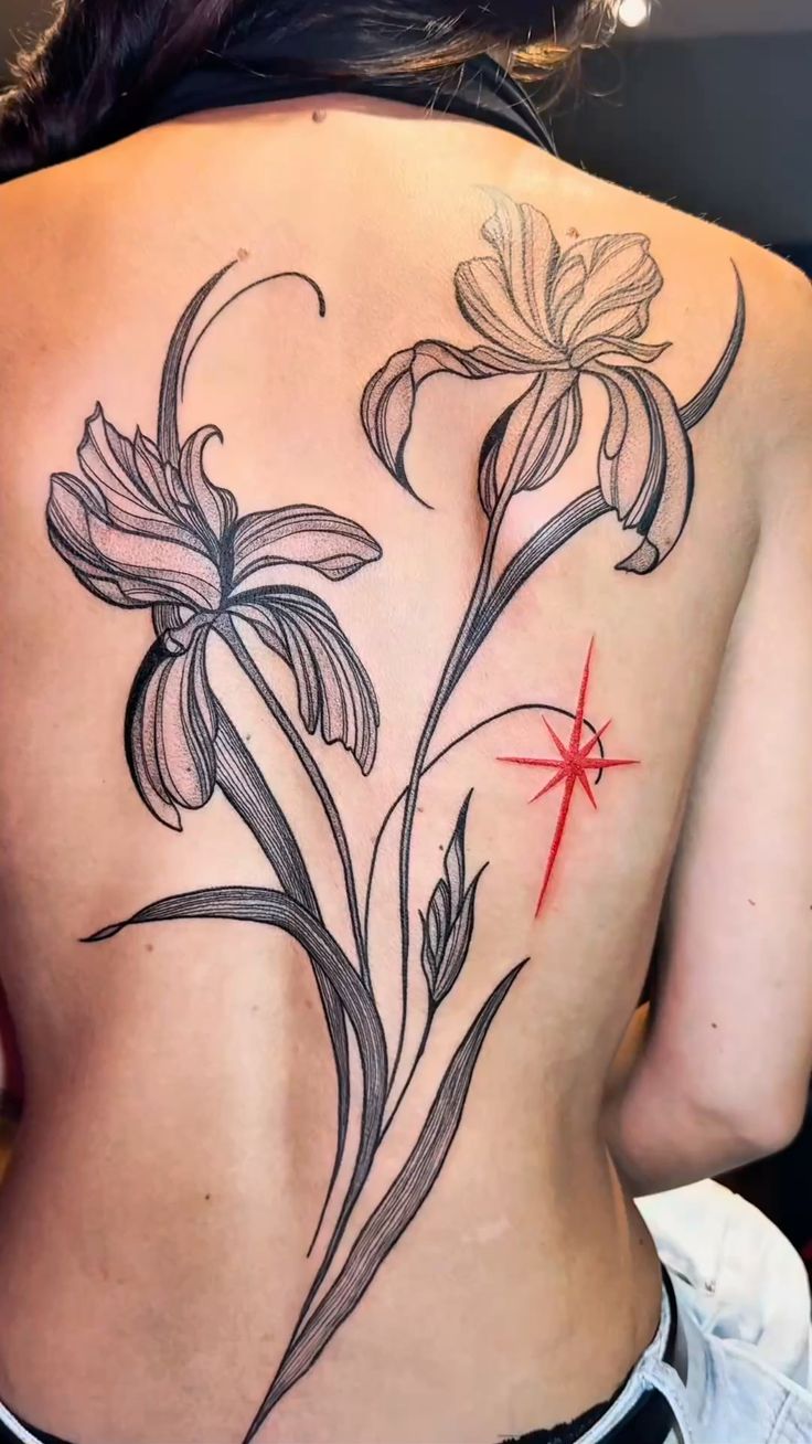 This tattoo has that instant wow factor, but it still feels refined instead of overwhelming. The two oversized blooms stretch across the back with this gorgeous editorial energy, almost like a fashion illustration brought to life on skin. What makes it especially memorable is the sharp Red star detail off to the side, which gives the whole design a flash of attitude and keeps the floral work from feeling too soft or expected. There is drama here, yes, but it is elegant drama. It feels like the kind of piece someone chooses when they want their tattoo to look artistic, intentional, and a little bit fearless. The long stems and dark curves pull everything downward beautifully, giving the back a lengthened, sculpted effect that feels powerful and feminine at the same time.