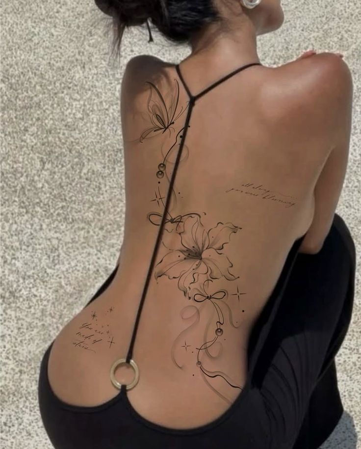 If you have been saving flower tattoo ideas and waiting for one that feels special, this is a lovely one to try now. It is especially appealing for women who want something more expressive than a centered spine tattoo but still want the same elegant elongating effect. The flowing design can make the back look longer and softer, and it pairs beautifully with low-back silhouettes and simple evening styling. Ask for a soft stencil and fine shading so the tattoo keeps that airy, effortless mood instead of becoming too heavy. This one really is all about confidence through movement.