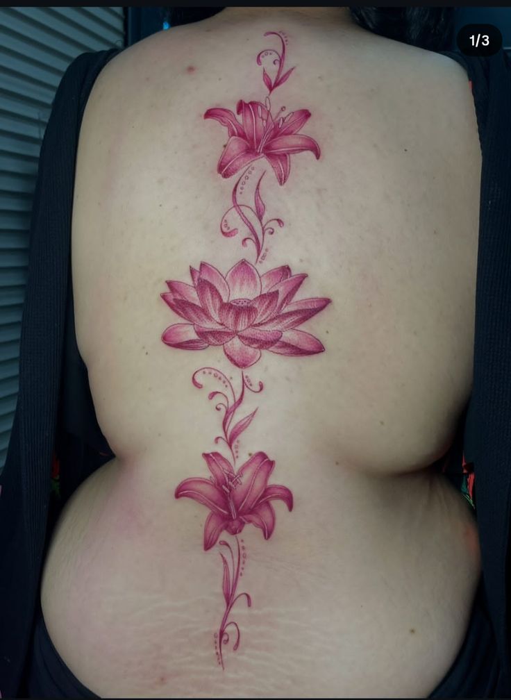 This one is pure statement energy. The Lotus at the center gives the piece a grounded, symbolic feeling, while the Lily flowers above and below stretch the whole design into something almost ceremonial. The pink tone keeps it soft, but the scale gives it power. It is the kind of tattoo that turns the back into a full composition, not just a placement. There is something really beautiful about the symmetry here too. It feels intentional, centered, and confident, like a piece chosen not on impulse but because it truly means something.