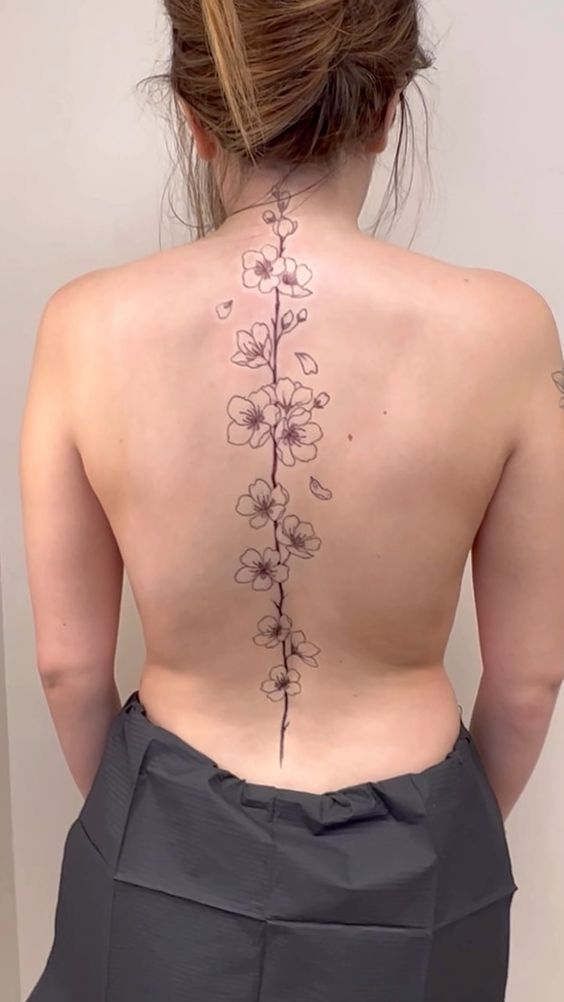 This tattoo has such a sweet, graceful rhythm to it. The blossoms travel down the spine like a delicate branch in early bloom, and the effect is soft without disappearing. It feels fresh, pretty, and quietly romantic, with just enough spacing between each flower to let the whole design breathe. I especially love how the line stays slender from top to bottom, because it keeps the tattoo elegant rather than dense. It has that understated beauty that works with your body instead of sitting on top of it.