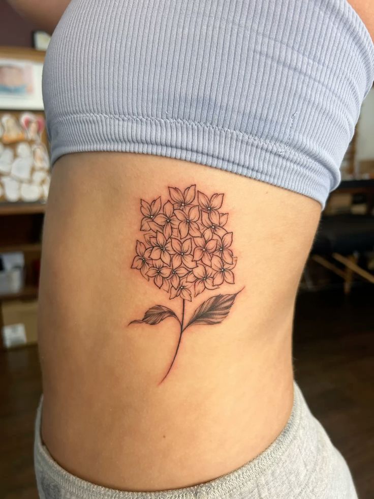 This ribcage hydrangea is all soft curves and quiet details. Dozens of tiny petals are traced in gentle fine-line strokes, forming a cloud-like bloom that feels delicate without disappearing on the skin. The slender stem and two simple leaves keep the composition grounded, while the placement along the side of the torso adds a subtle, intimate edge. It’s the kind of tattoo that feels like a secret garden only a few people get to see.