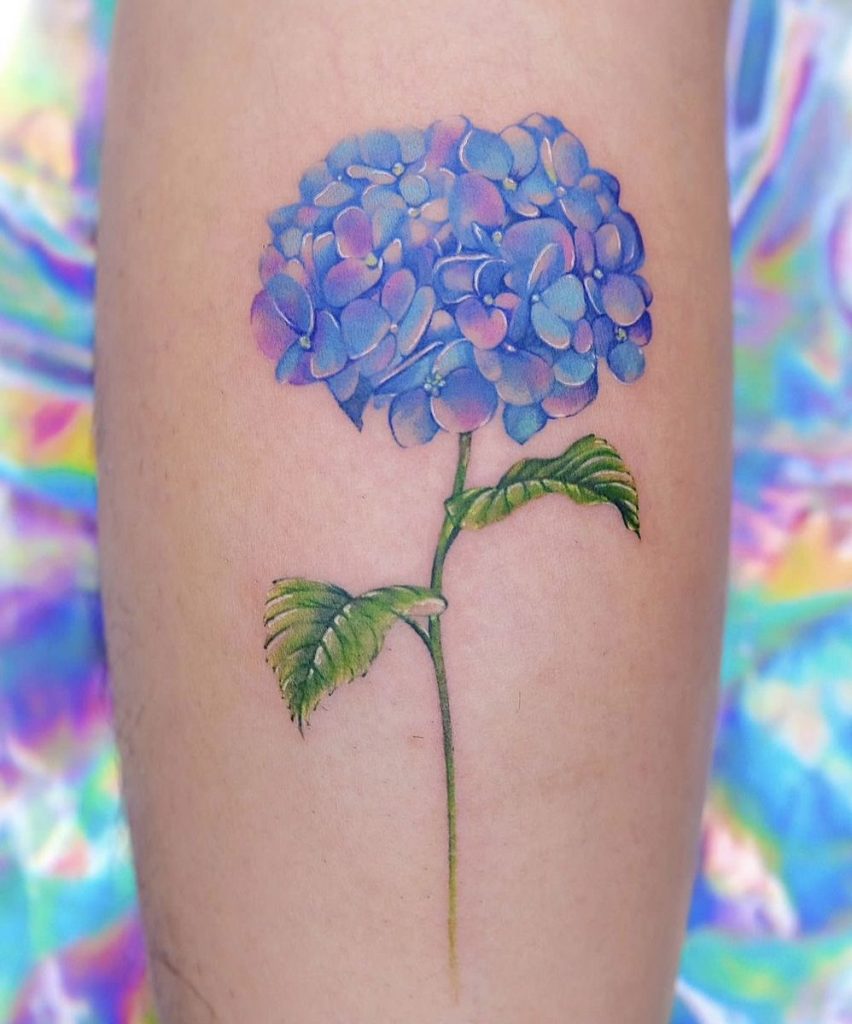 This hydrangea looks like it’s been dipped in moonlight. Layers of soft blue and lilac petals create a dreamy, almost pearly glow, while the slim green stem keeps the whole design feeling light and graceful. It’s one of those hydrangea tattoo ideas that feels fresh and modern but still quietly romantic, like carrying a little piece of your favorite garden wherever you go. The elongated silhouette is flattering on the calf or forearm, giving just enough presence without feeling heavy.